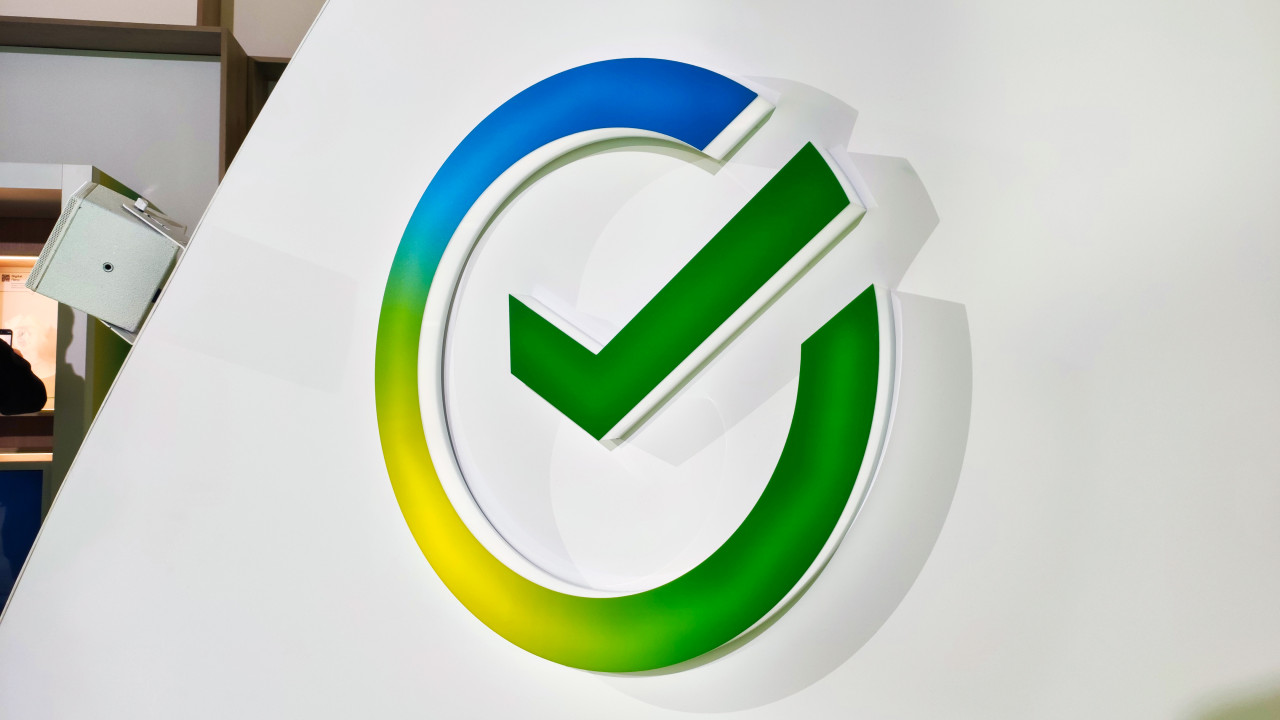 На изображении представлен объёмный логотип Сбера, установленный на наклонной панели внутри павильона на выставке «Россия» на ВДНХ. Логотип выполнен в фирменных цветах с плавным градиентом, а рядом заметна часть динамической стендовой конструкции. Освещение подчеркивает контуры знака, создавая выразительное визуальное решение. Сцена может быть использована в материалах о корпоративном дизайне, оформлении выставок и визуальной айдентике брендов.
