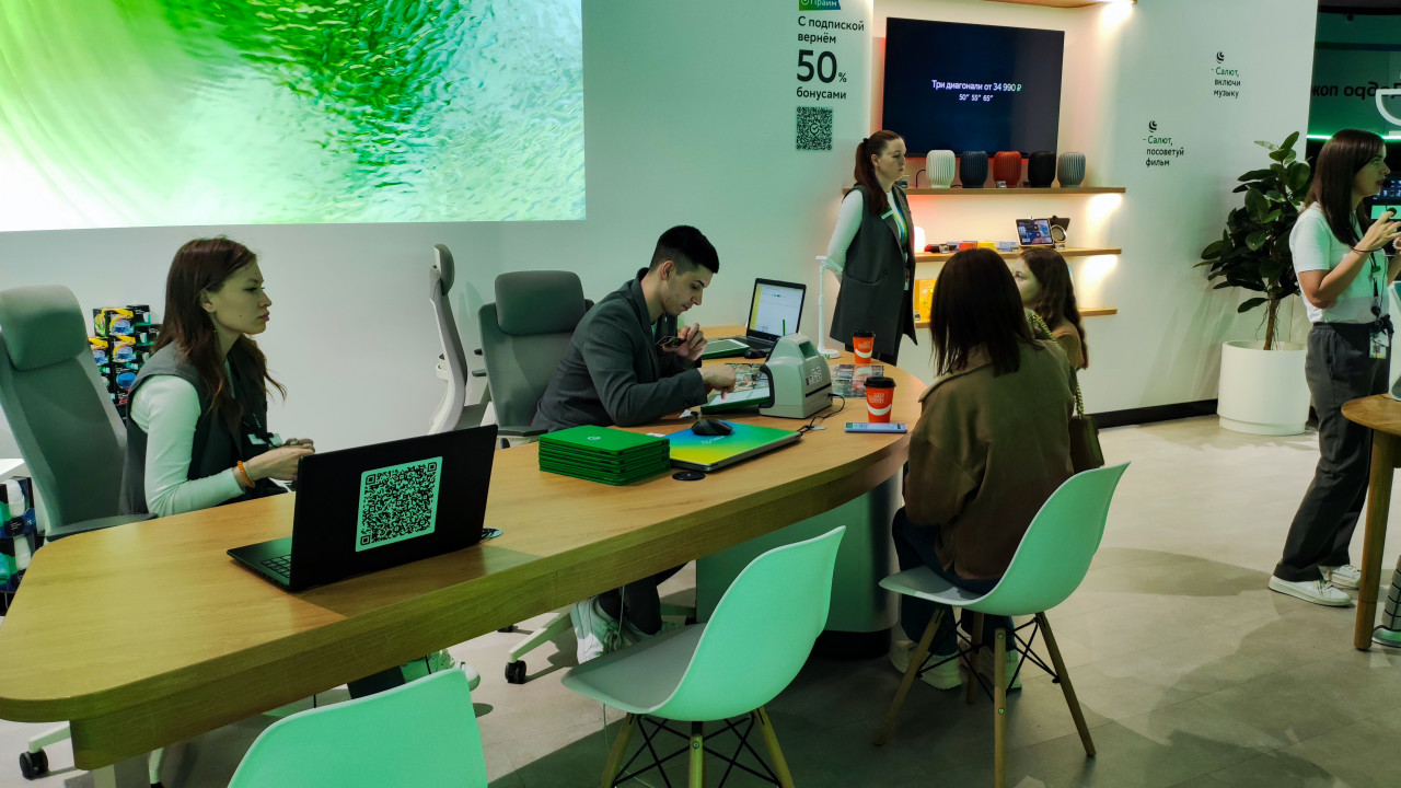 вднх выставка россия москва павильон сбера музей экспозиция консультация Сбер ВДНХ выставка Россия сотрудники посетители сервис финтех офисная зона ноутбук рабочее место цифровой экран интерьер умные устройства общение обслуживание презентация демонстрация бренд деловая среда технологии современный офис зона приема клиентский опыт павильон оборудование рабочий процессПохожие фотографии