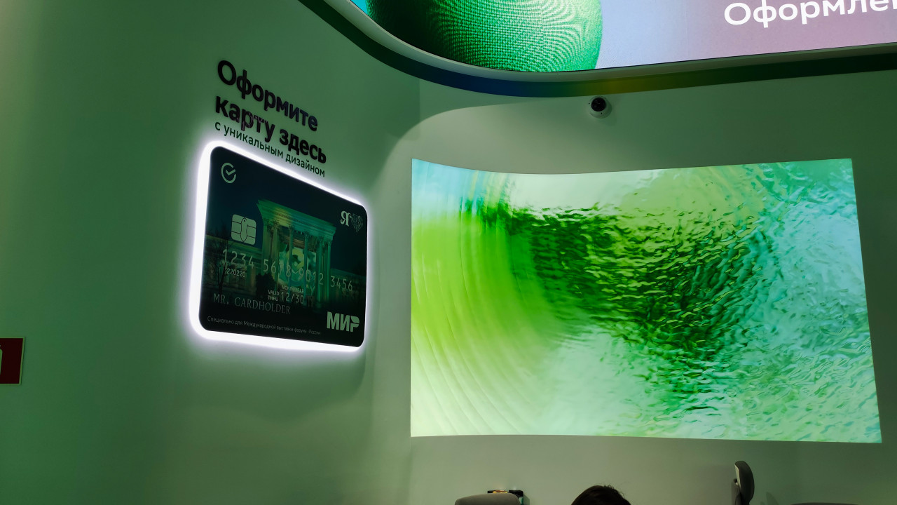 На изображении показана часть стенда павильона Сбера на выставке «Россия» на ВДНХ, где размещена рекламная панель с предложением оформить банковскую карту. На стене виден крупный макет карты «Мир» с иллюстрацией колоннады, а рядом отображается большой цифровой экран с зелёной визуализацией. В нижней части кадра заметны спинки кресел зоны консультаций. Сцена демонстрирует оформление пространства для презентации банковских продуктов. Фотография может использоваться в материалах о финтех-сервисах, банковской рекламе и выставочных решениях.