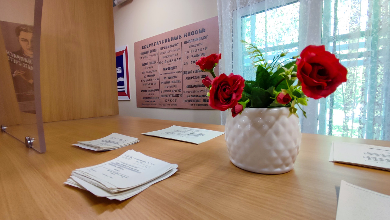 Документы вкладчиков и элементы интерьера сберкассы в музейной реконструкции