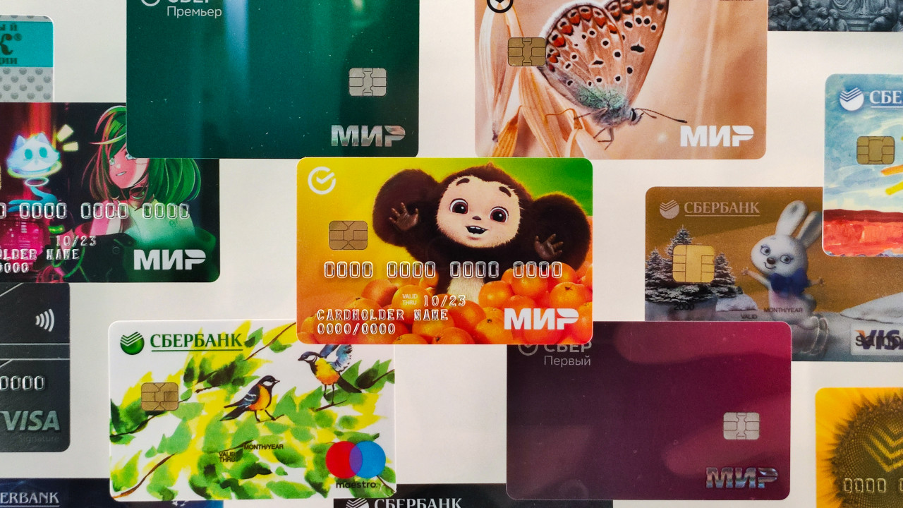 Фрагмент стенда с банковскими картами Сбера, включая карту «Мир» с Чебурашкой