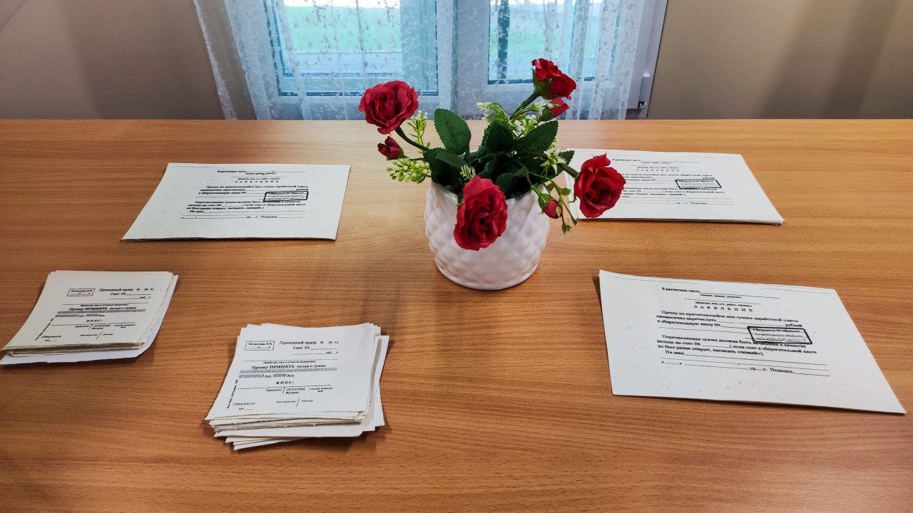 На снимке показан общий вид стола обслуживания с разложенными банковскими бланками и стопками документов для оформления вкладов, в центре размещён декоративный вазон с искусственными цветами. Экспозиция воспроизводит интерьер сберегательной кассы советского периода и относится к зоне «Прошлое» павильона Банка России «Умные финансы», расположенного в павильоне №71 ВДНХ в рамках выставки «Россия». Представленные формы использовались при приёме вкладов и оформлении операций. Фотография может использоваться в материалах о музейных реконструкциях, истории банковского обслуживания и финансовом просвещении.