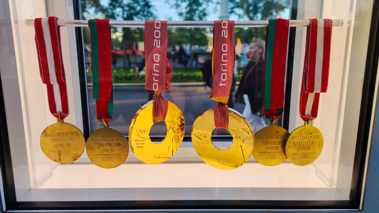 Золотые олимпийские медали Турин 2006 года по биатлону в экспозиции «Аллея славы»