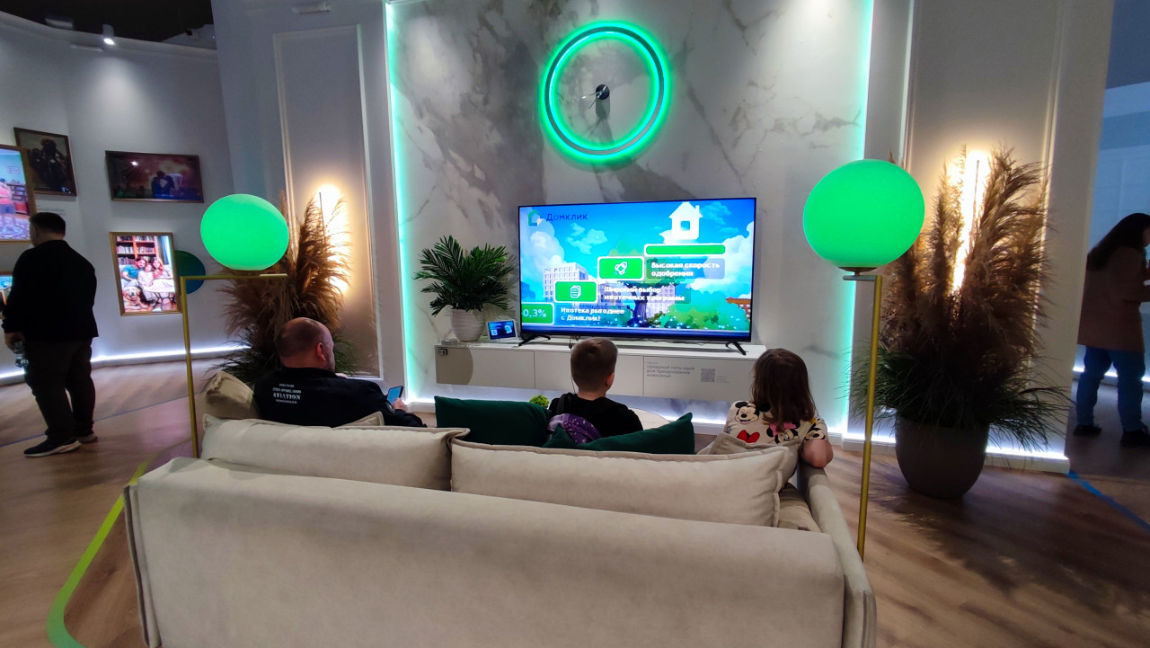 вднх москва выставка россия павильон музей экспозиция общественное пространство культурное событие выставочный формат гостиная зона Сбер ВДНХ выставка Россия экран Домклик интерьер посетители диван зеленый свет подсветка лампы дизайн презентация цифровой сервис демонстрация оформление стенда растения мультимедиа бренд офис будущего зона отдыха интерьерное решение сервисы визуализация технологияПохожие фотографии