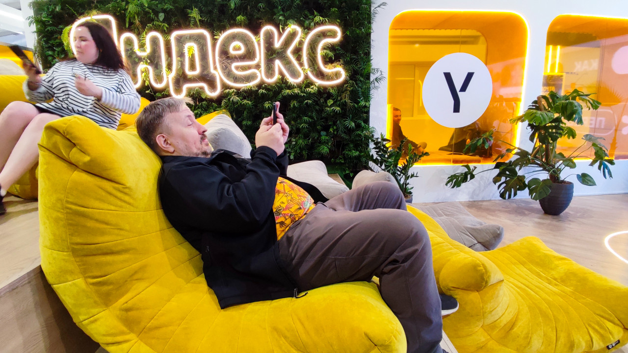 На фотографии запечатлена зона отдыха экспозиции Яндекса в павильоне «Е» выставки-форума «Россия» на ВДНХ. На переднем плане мужчина по имени Максим сидит на жёлтом мягком кресле и использует смартфон. Позади него расположена зелёная стена с неоновой вывеской «Яндекс». На ступенчатой платформе видны другие кресла и посетители. Справа в кадре частично заметны окна-порталы с логотипом «Y» и декоративные растения. Снимок демонстрирует атмосферу интерактивной выставочной зоны и может использоваться для материалов о публичных мероприятиях, цифровых сервисах и современных экспозициях.