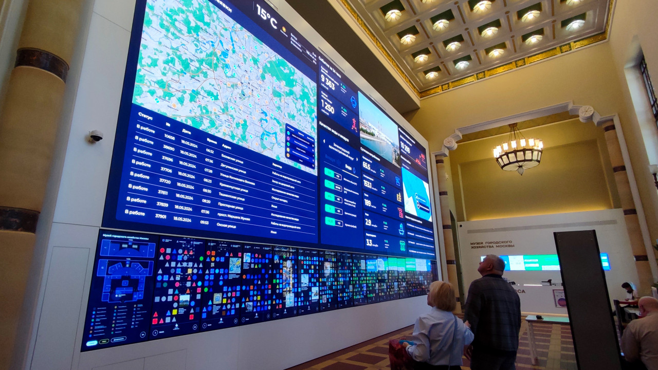 На фотографии изображён зал Музея городского хозяйства Москвы с масштабным цифровым экраном, отображающим данные о работе городских систем. В кадре видны интерактивные панели с картой города, таблицами, графиками и показателями состояния инфраструктуры. Экран используется для наглядной демонстрации процессов управления мегаполисом и работы коммунальных служб. Архитектура зала с колоннами и потолочным освещением подчёркивает общественный характер пространства. Снимок выполнен в 2024 году в рамках выставки-форума «Россия» на ВДНХ. Фотография может использоваться для публикаций о цифровых решениях, управлении городом и музейных экспозициях.