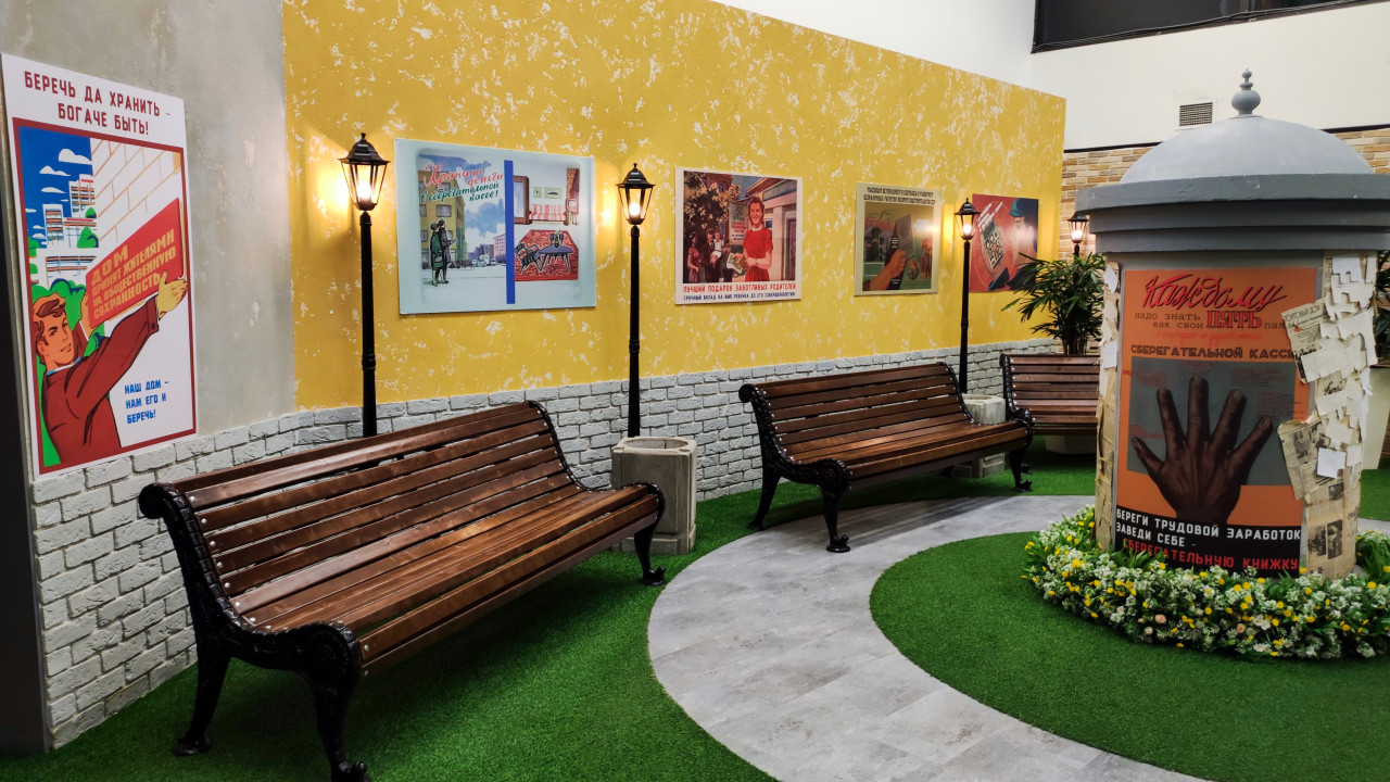 Интерьер зоны «Прошлое» с советскими плакатами и уличной мебелью