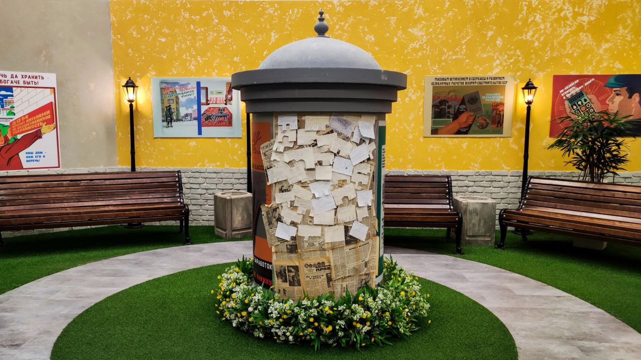 Фотография показывает центральный элемент музейной экспозиции — цилиндрический столб объявлений, установленный в оформленном интерьерном пространстве. Поверхность столба оклеена газетами и многочисленными рукописными записками с предложениями услуг и личными сообщениями. Вокруг размещены декоративные растения и элементы, имитирующие благоустройство городской площади. Инсталляция отражает формы неофициального обмена информацией в городской среде до распространения цифровых платформ. Съёмка произведена в 2024 году. Изображение может использоваться в материалах о городской культуре, истории коммуникаций и музейных реконструкциях.