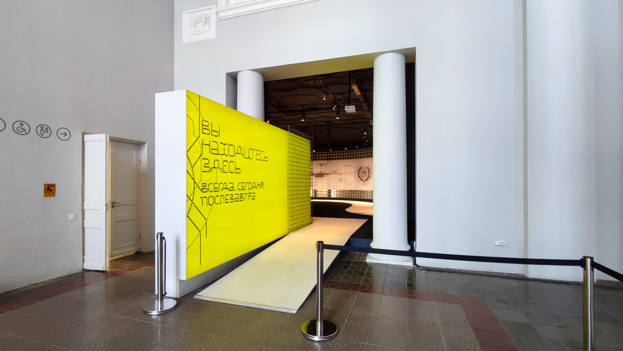 На фотографии показан вход в выставочное пространство «Вы находитесь здесь. Всегда. Сегодня. Послезавтра», организованное Музеем транспорта Москвы в павильоне № 26 «Транспорт СССР» на ВДНХ. В кадре — широкий проём с колоннами, жёлтая входная инсталляция с текстом экспозиции, направляющий пандус и элементы навигации. Интерьер сочетает историческую архитектуру павильона и современное выставочное оформление. Снимок может использоваться в материалах о музейных экспозициях, культурных событиях, городской инфраструктуре и выставочной деятельности.