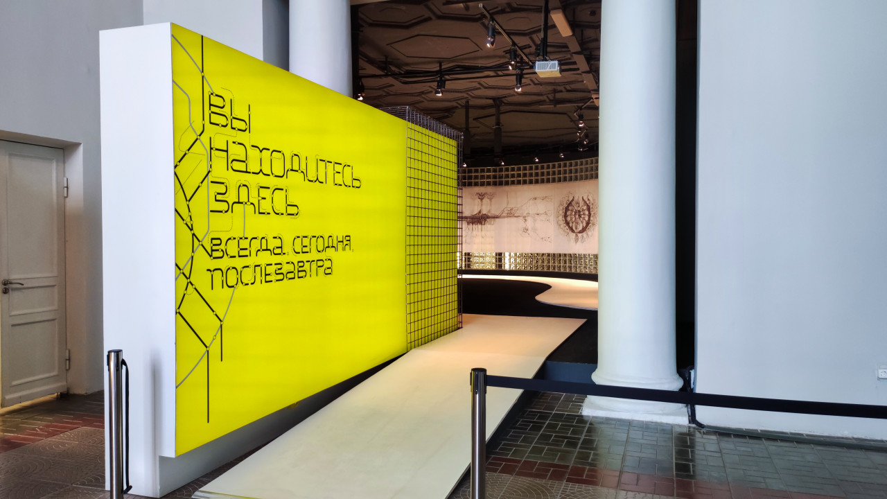 Снимок демонстрирует фрагмент выставочной инсталляции с жёлтой стеной и текстом «Вы находитесь здесь. Всегда. Сегодня. Послезавтра» в павильоне «Транспорт СССР» на ВДНХ. В кадре — графические линии, стилизованные под транспортные схемы, колонны исторического зала и переход в основную часть экспозиции. Инсталляция отражает концепцию путешествия во времени и роли транспортной системы в формировании города. Фотография подходит для публикаций о музейном дизайне, выставочной графике, современной урбанистике и культурных проектах Москвы.