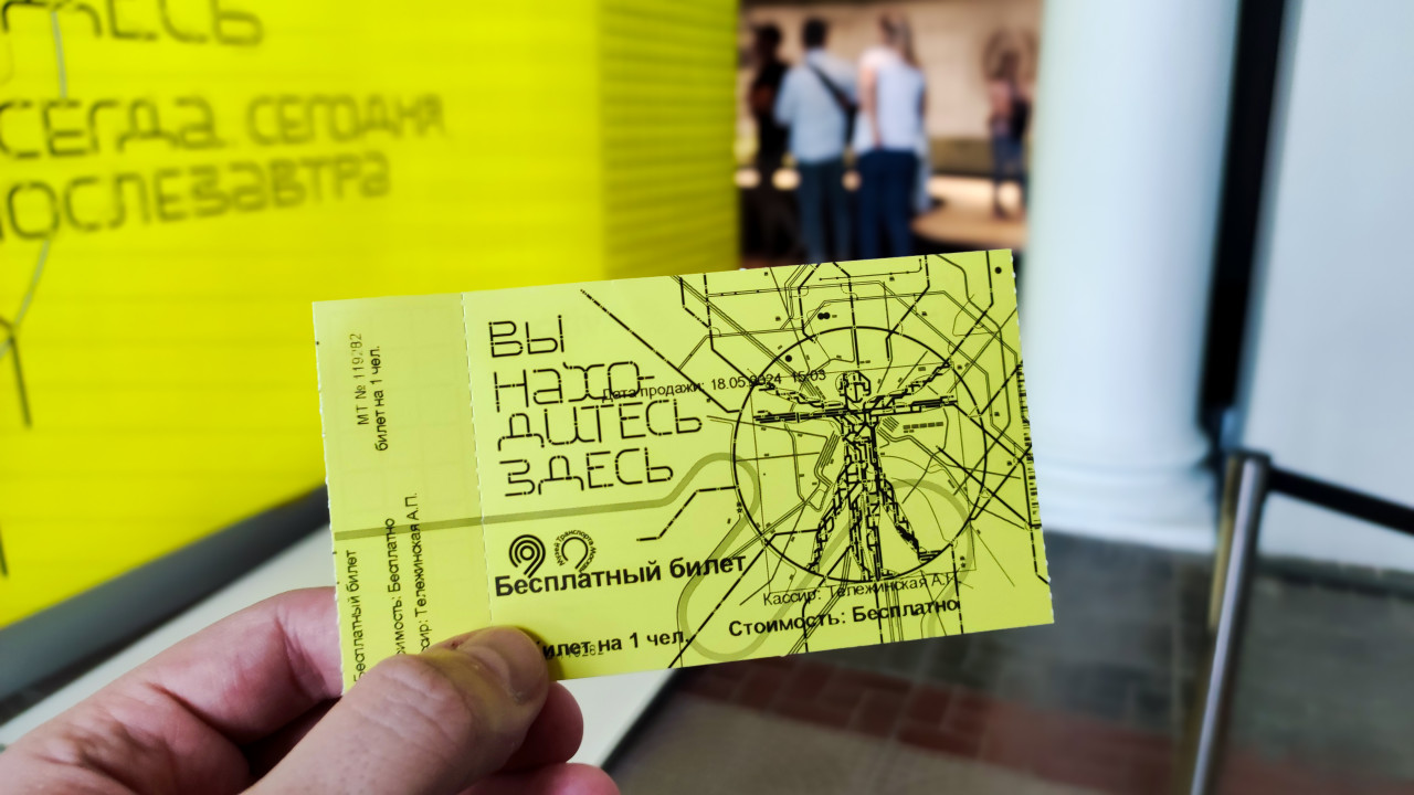 Фотография показывает входной билет на выставку «Вы находитесь здесь. Всегда. Сегодня. Послезавтра», удерживаемый в руке посетителя на фоне выставочного пространства павильона «Транспорт СССР» на ВДНХ. На билете различимы элементы графического оформления, транспортная схема и текстовая информация. На заднем плане — жёлтая инсталляция и посетители экспозиции. Снимок отражает пользовательский опыт посещения музея и подходит для материалов о культурных мероприятиях, музейной навигации и городской культурной жизни.