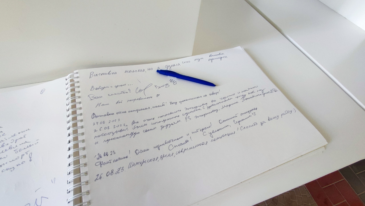 Фотография демонстрирует книгу отзывов, размещённую в зоне обратной связи выставки «Вы находитесь здесь. Всегда. Сегодня. Послезавтра» Музея транспорта Москвы в павильоне «Транспорт СССР» на ВДНХ. В кадре — раскрытый альбом с рукописными записями посетителей и шариковой ручкой, оставленной на столе. Экспонат отражает вовлечённость аудитории и фиксирует личные впечатления от экспозиции, посвящённой прошлому, настоящему и будущему городского транспорта. Снимок подходит для публикаций о музейной работе и взаимодействии с посетителями.