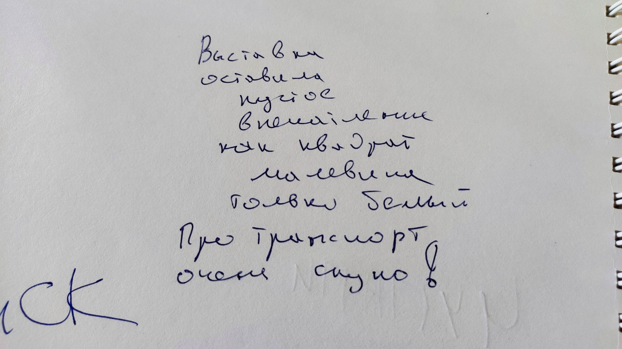 На фотографии запечатлён фрагмент книги отзывов выставки «Вы находитесь здесь. Всегда. Сегодня. Послезавтра» Музея транспорта Москвы, проходившей в павильоне «Транспорт СССР» на ВДНХ. В кадре — рукописный текст с личным мнением посетителя об экспозиции, посвящённой теме транспорта и городской среды. Этот элемент подчёркивает диалог между музеем и аудиторией и служит частью нематериального наследия выставочного проекта. Изображение может использоваться в материалах о музейной коммуникации и культурных инициативах.