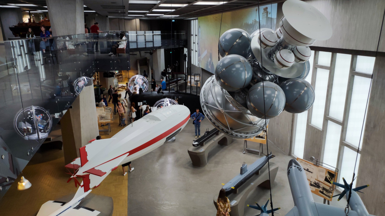 На фотографии запечатлён общий вид крупного выставочного пространства павильона «АТОМ» на ВДНХ с подвешенными и установленными макетами авиационной и ракетной техники. В кадре видны модели летательных аппаратов, сферическая конструкция с техническими элементами, стеклянные балконы и посетители экспозиции. Пространство иллюстрирует развитие высоких технологий второй половины XX века, связанных с оборонной промышленностью и научными исследованиями. Снимок подходит для материалов о музейных экспозициях, инженерных достижениях и научно-технической истории.