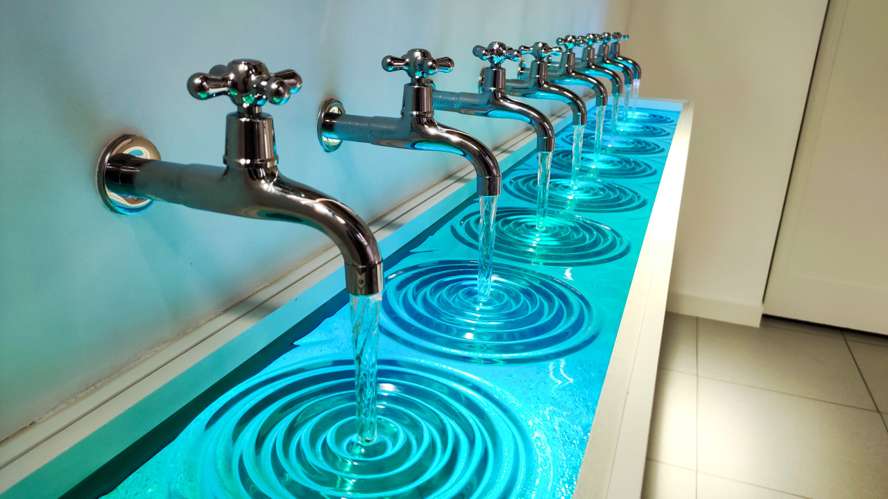 Фотография сделана в Музее городского хозяйства Москвы в павильоне №5 ВДНХ во время форума «Россия» 2024 года. В кадре представлен интерактивный стенд, демонстрирующий процесс подачи очищенной воды конечному потребителю. Ряд хромированных кранов подаёт воду в длинный прозрачный резервуар с подсветкой, визуализируя стабильность и равномерность водного потока. Экспозиция является частью раздела, посвящённого водоснабжению города, и дополняет рассказ о работе очистных сооружений и распределительных сетей. Снимок может использоваться в публикациях о городском хозяйстве, инженерных системах, ЖКХ и музейных образовательных проектах.