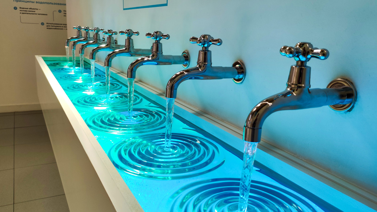 На снимке показан наклонный ракурс музейной экспозиции, посвящённой подаче очищенной воды, в Музее городского хозяйства Москвы, расположенном в павильоне №5 ВДНХ. Фотография выполнена во время выставки-форума «Россия» в 2024 году. В кадре виден ряд хромированных кранов, из которых вода поступает в прозрачный резервуар с яркой подсветкой, создавая визуальные волновые эффекты. Экспозиция демонстрирует конечный результат работы очистных сооружений и распределительных сетей. Фотография подходит для иллюстрации тем водоснабжения, инженерной инфраструктуры и музейных образовательных экспозиций.