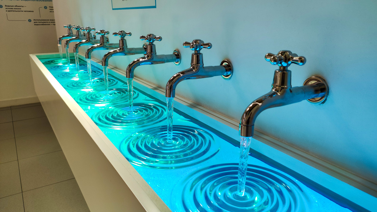 Фотография сделана в Музее городского хозяйства Москвы, расположенном в павильоне №5 ВДНХ, во время выставки-форума «Россия» в 2024 году. В кадре запечатлён длинный ряд кранов, подающих воду в подсвеченный резервуар, где формируются равномерные круговые волны. Экспонат является частью раздела, посвящённого водоснабжению, и наглядно показывает стабильность работы городской системы подачи воды. Установка используется для объяснения принципов распределения питьевой воды и контроля её качества. Снимок может быть использован в публикациях о коммунальных службах, инженерной инфраструктуре и музейных образовательных программах.