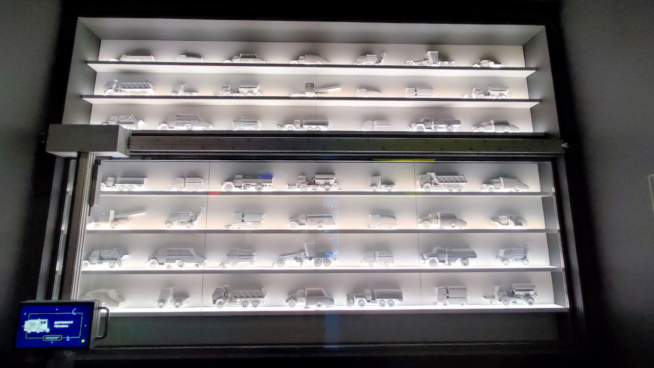 На фотографии показана витрина с масштабными моделями дорожной и коммунальной техники, размещёнными на нескольких горизонтальных полках с равномерной подсветкой. В кадре представлены макеты грузовых автомобилей, самосвалов, уборочных и специализированных машин, выполненные в едином светлом цвете. Снимок сделан в 2024 году в Музее городского хозяйства Москвы, расположенном в павильоне №5 ВДНХ, во время выставки-форума «Россия». Экспозиция наглядно демонстрирует разнообразие техники, используемой для обслуживания городской инфраструктуры, дорог и коммунальных систем. Фотография может использоваться в материалах о городском хозяйстве, транспорте и музейных экспозициях.