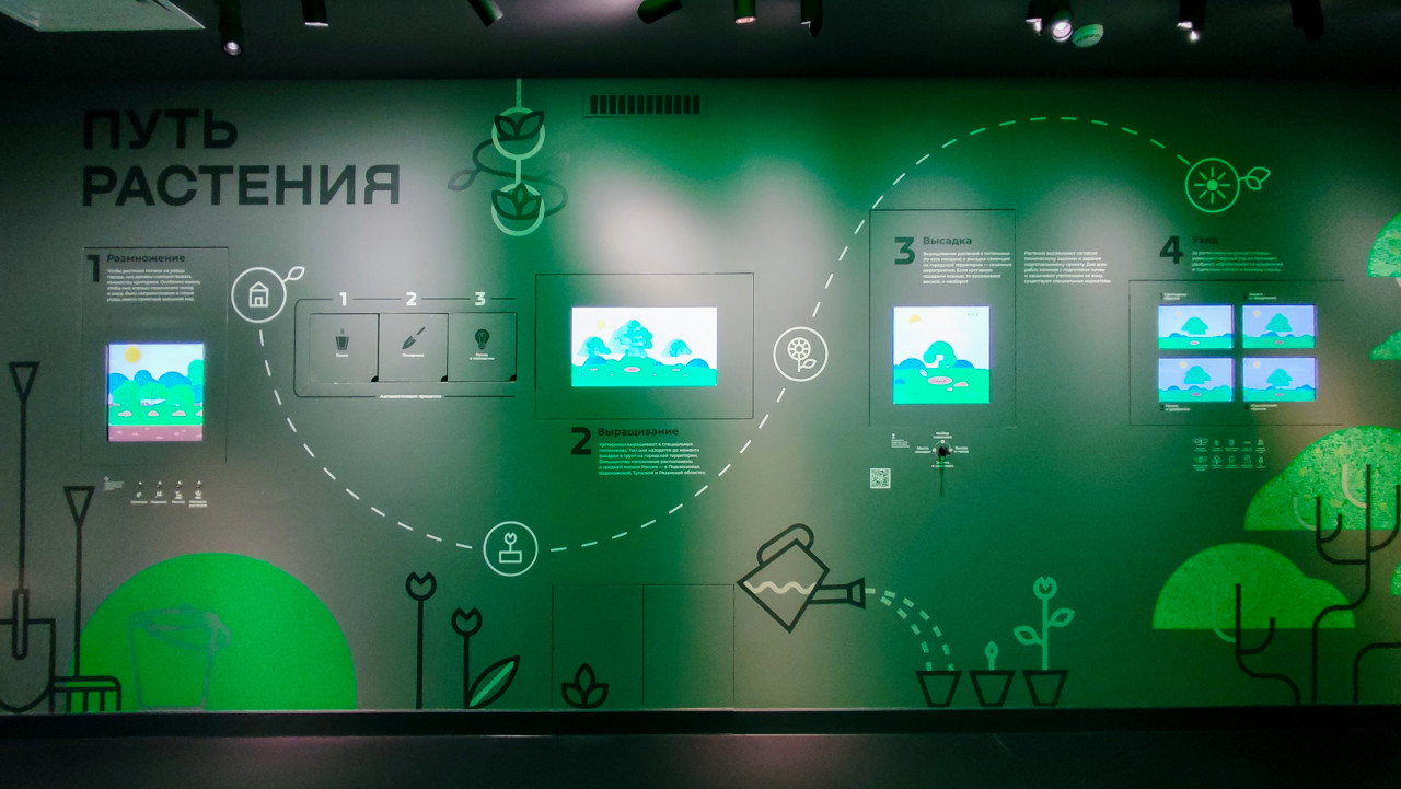 Фотография показывает интерактивную зону «Путь растения», представленную в экспозиции Музея городского хозяйства Москвы в павильоне №5 ВДНХ. В кадре видна тематическая стена с инфографикой, экранами и визуальными схемами, рассказывающими о этапах выращивания растений — от посадки до ухода и развития. Экспозиция оформлена с использованием графических символов, подсветки и обучающих элементов, предназначенных для посетителей разных возрастов. Инсталляция демонстрирует процессы озеленения и роль растений в формировании городской среды. Снимок сделан в 2024 году во время выставки-форума «Россия». Фотография подходит для материалов об экологии, просветительских и музейных проектах.