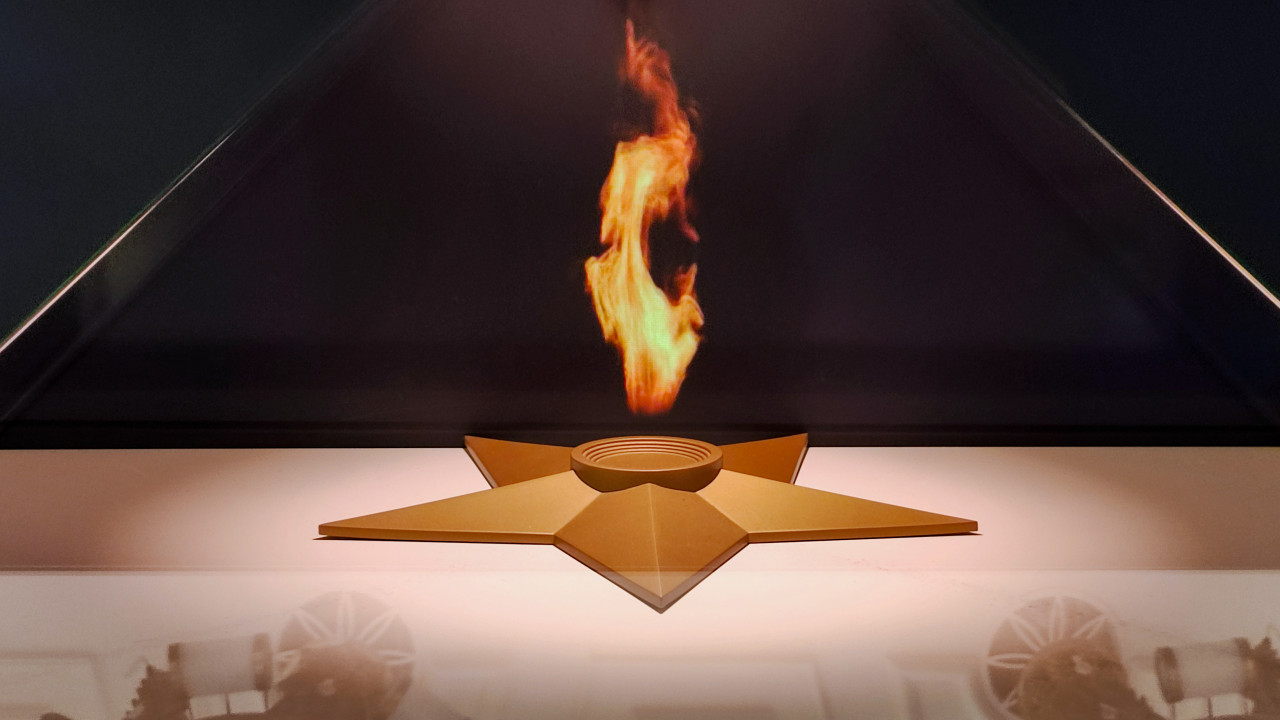 На фотографии представлен экспозиционный объект, имитирующий Вечный огонь. В кадре видна стилизованная звезда с углублением в центре, над которой проецируется изображение пламени. Тёмный фон и направленное освещение усиливают визуальный акцент на символе огня. Экспозиция демонстрирует мемориальную тематику и используется в музейном контексте для рассказа о памятниках и традициях увековечения памяти. Снимок сделан в 2024 году в помещении выставки. Фотография подходит для использования в материалах о музеях, памятных датах, истории и мемориальных инсталляциях.