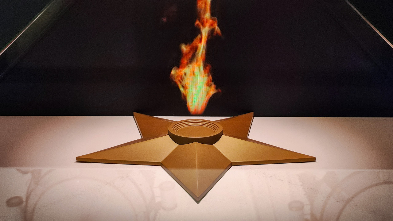 На фотографии изображён музейный макет Вечного огня, представленный в выставочной экспозиции. В кадре видна стилизованная пятиконечная звезда с центральной чашей, над которой воспроизводится изображение пламени на экране. Композиция выполнена в минималистичном стиле, с акцентом на символику мемориала и визуальный эффект огня. Экспозиционный объект используется для иллюстрации темы памяти, военной истории и мемориальной культуры. Снимок сделан в 2024 году в интерьере выставочного пространства. Фотография подходит для материалов о музейных инсталляциях, памятных местах, историческом наследии и тематических экспозициях.