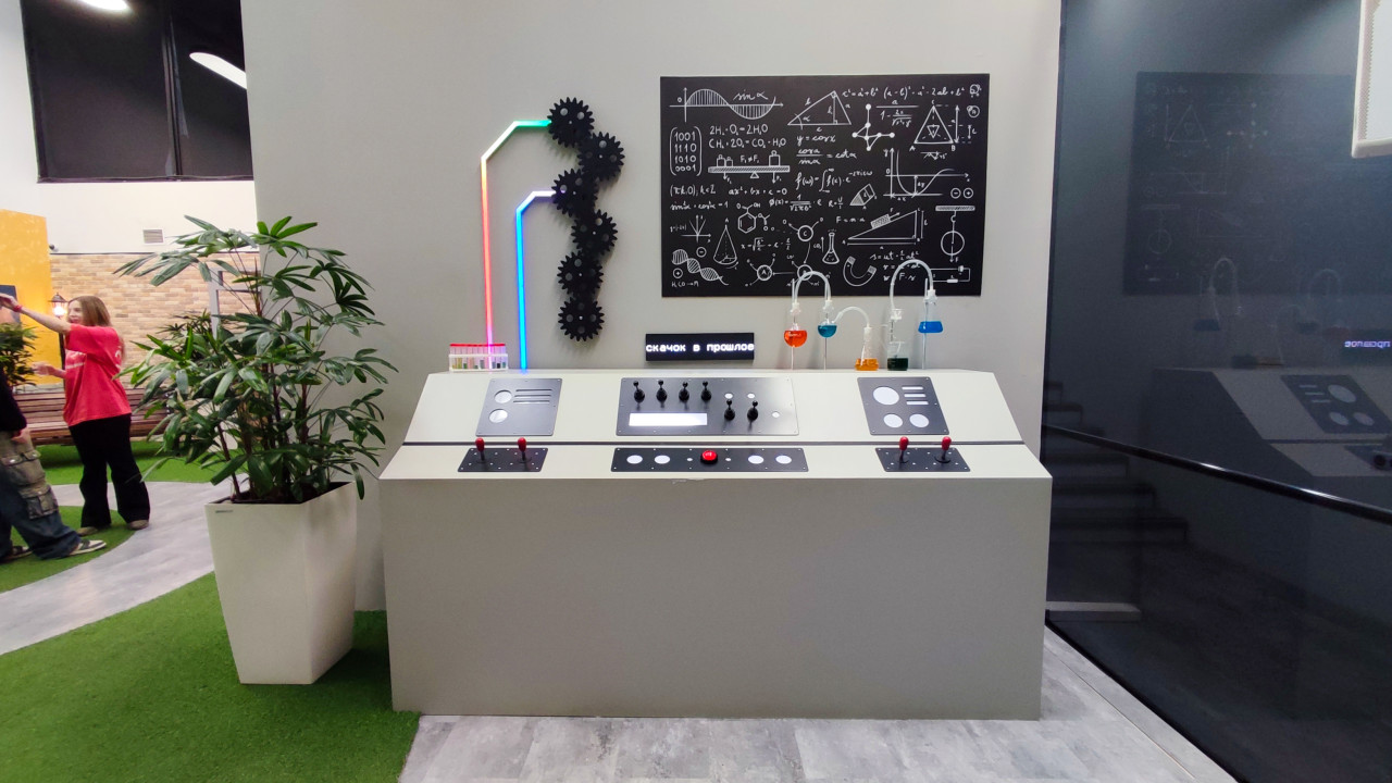 На фотографии представлен общий вид интерактивного стенда павильона Банка России «Умные финансы», установленного в павильоне №71 ВДНХ. В кадре видна панель управления, лабораторная установка с колбами, графическая доска с формулами, декоративные элементы и зона для посетителей. Экспозиция демонстрировала развитие финансовых и платёжных технологий в доступной форме. Снимок сделан в 2024 году во время работы выставки «Россия». Фотография подходит для иллюстраций о выставочных пространствах, финтех-проектах и музейных интерактивных форматах.