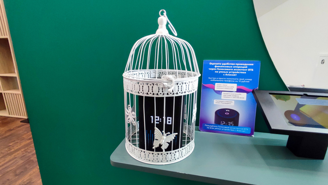 На фотографии запечатлён экспонат интерактивной зоны павильона Банка России «Умные финансы» на выставке «Россия» на ВДНХ, размещённый в павильоне №71. В кадре видна умная колонка с цифровыми часами, установленная внутри декоративной металлической клетки белого цвета с орнаментом и фигуркой бабочки. Экспонат иллюстрирует интеграцию голосовых ассистентов и цифровых сервисов в повседневную жизнь и финансовые операции. Рядом расположен информационный стенд с описанием возможностей голосового управления банковскими сервисами. Снимок сделан в 2024 году. Фотография может использоваться в материалах о финтехе, умном доме, цифровых помощниках и финансовых технологиях.