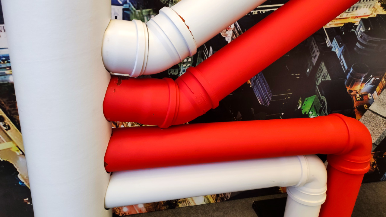 На фотографии показан фрагмент музейной инсталляции, представляющей инженерные коммуникации городского хозяйства. В кадре крупным планом видны соединения и отводы труб красного и белого цвета, смонтированные в демонстрационной конструкции. Элементы иллюстрируют принципы прокладки и соединения трубопроводов, используемых в системах водоснабжения, отопления и других коммунальных сетях. На заднем плане размещена декоративная панель с городским изображением. Экспозиция выполнена в образовательных целях и позволяет наглядно представить устройство инженерной инфраструктуры. Снимок сделан в 2024 году в Музее городского хозяйства Москвы на ВДНХ.