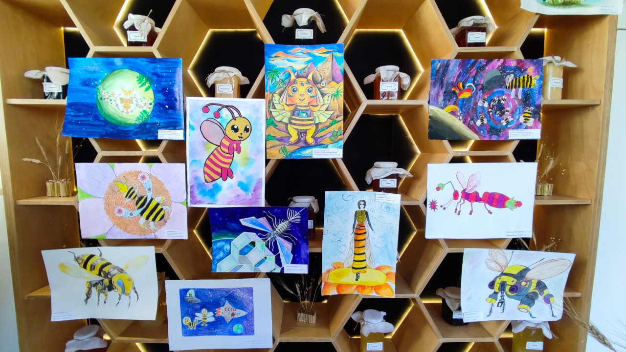 вднх москва выставка россия павильон выставочный комплекс музей экспозиция общественное пространство культурное событие презентация культура выставка детские рисунки пчелы пчеловодство мед продукты пчеловодства арт работы детское творчество оформление выставки образовательный проект экология природные мотивы соты пчелиные соты деревянные конструкции подсветка интерьер культурное пространство тематическая зонаПохожие фотографии