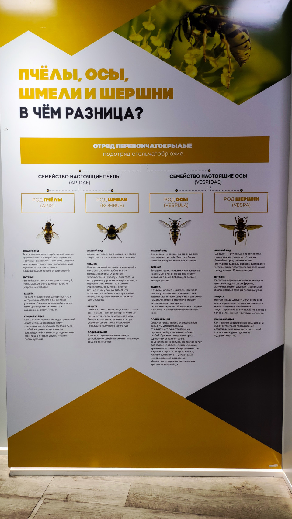 На фотографии запечатлён вертикальный информационный стенд выставки «Вокруг пчелы» в павильоне №28 «Пчеловодство» на ВДНХ. Стенд содержит заголовок «Пчёлы, осы, шмели и шершни: в чём разница?» и схемы, посвящённые отряду перепончатокрылых, с иллюстрациями и краткими описаниями семейств и родов. Дизайн выполнен в контрастной графике с текстовыми блоками и изображениями насекомых. Экспозиция была открыта в 2024 году Государственным биологическим музеем имени К. А. Тимирязева. Фотография подходит для материалов об образовательных выставках и научном просвещении.