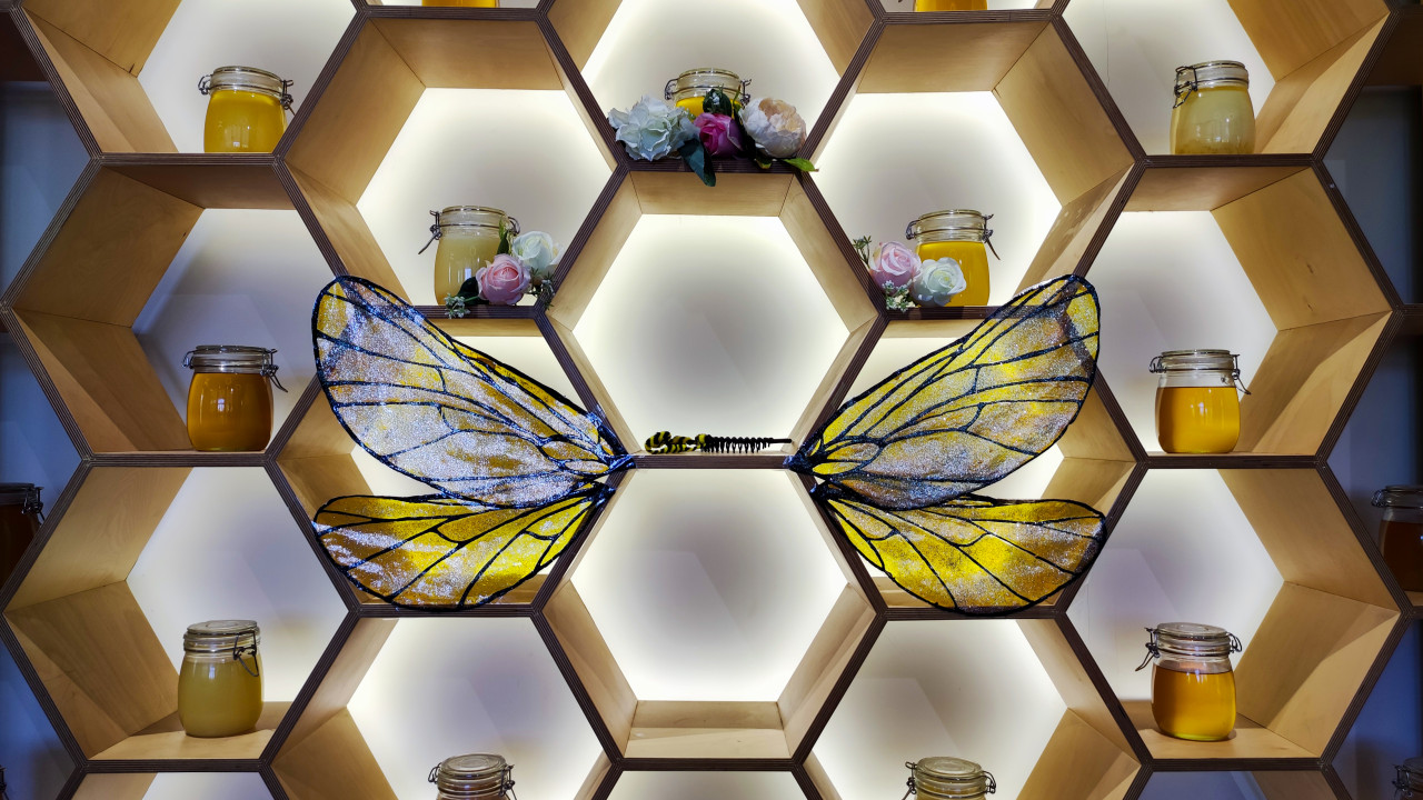 Декоративная инсталляция с крыльями пчелы и банками меда