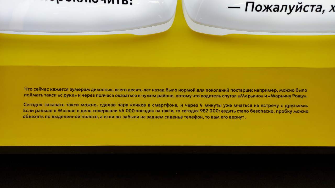 На фотографии запечатлена информационная текстовая панель выставки «Вы находитесь здесь. Всегда. Сегодня. Послезавтра» Музея транспорта Москвы, размещённая на жёлтом фоне. В кадре виден развернутый текст, рассказывающий об изменениях в работе такси в Москве за последние годы, росте количества поездок и развитии сервисов. Панель дополняет инсталляции с цитатами пассажиров и даёт контекст эволюции таксомоторных перевозок в городе. Экспонат представлен в павильоне «Транспорт СССР» № 26 на ВДНХ и может использоваться в материалах о городском транспорте и урбанистике.