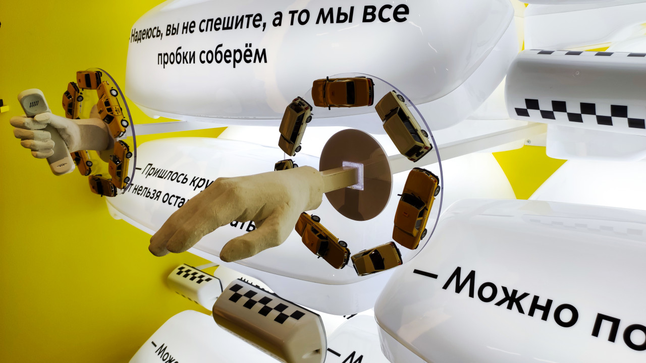 Снимок выполнен в зале выставки «Вы находитесь здесь. Всегда. Сегодня. Послезавтра» в павильоне «Транспорт СССР» на территории ВДНХ. В центре кадра — декоративная рука, указывающая жестом, окружённая кольцом из масштабных моделей автомобилей такси. На заднем плане размещены текстовые панели с репликами пассажиров, отражающие повседневную речь и типичные диалоги в городском транспорте. Инсталляция демонстрирует социальный и коммуникационный аспект транспортной системы мегаполиса и используется для иллюстрации тем урбанистики и социологии города.