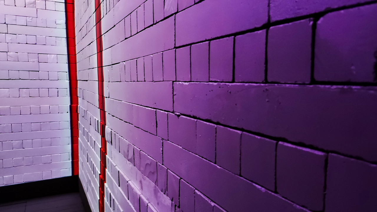 На фотографии показан фрагмент кирпичной стены подземного уровня павильона «АТОМ» на ВДНХ, освещённый декоративной подсветкой фиолетового цвета. Кладка выполнена из прямоугольных кирпичей и подчёркивает индустриальный характер пространства. Подобные элементы используются в оформлении подземных этажей комплекса, где размещён музей советского атомного проекта. Снимок отражает архитектурные особенности современного павильона, построенного в 2017–2023 годах, и может применяться для иллюстрации интерьерных и выставочных решений.