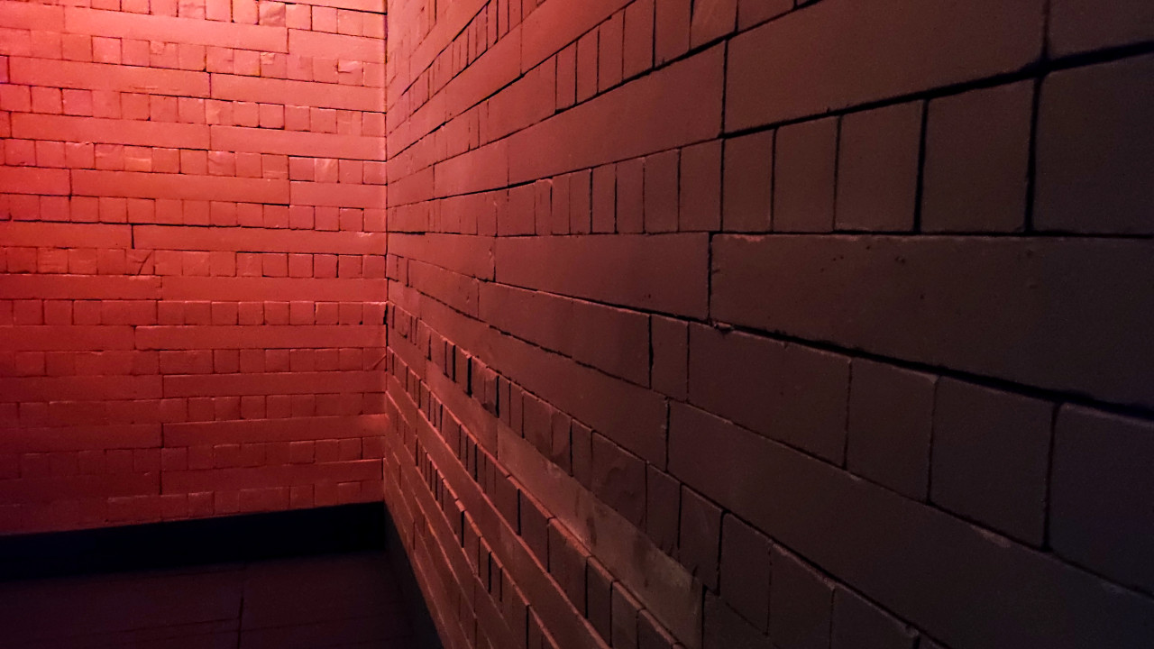 Кирпичная кладка подземного коридора павильона «АТОМ» с красной подсветкой
