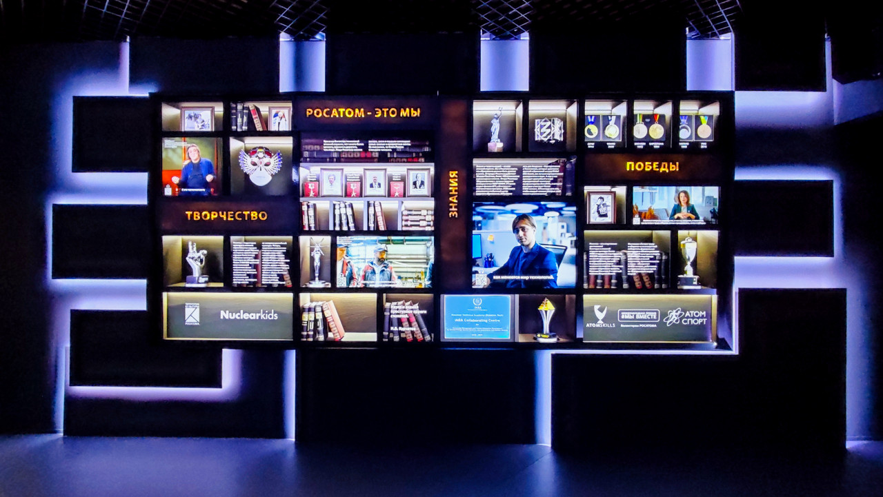 Фотография запечатлела мультимедийную стену экспозиции «Росатом — это мы», размещённую в павильоне «АТОМ» на ВДНХ. На стенде представлены экраны, витрины с наградами, книгами, фотографиями сотрудников и видеоматериалы, посвящённые истории, достижениям и корпоративной культуре госкорпорации «Росатом». Экспозиция носит просветительский характер и рассказывает о людях атомной отрасли. Снимок сделан в 2023 году в рамках выставки-форума «Россия».