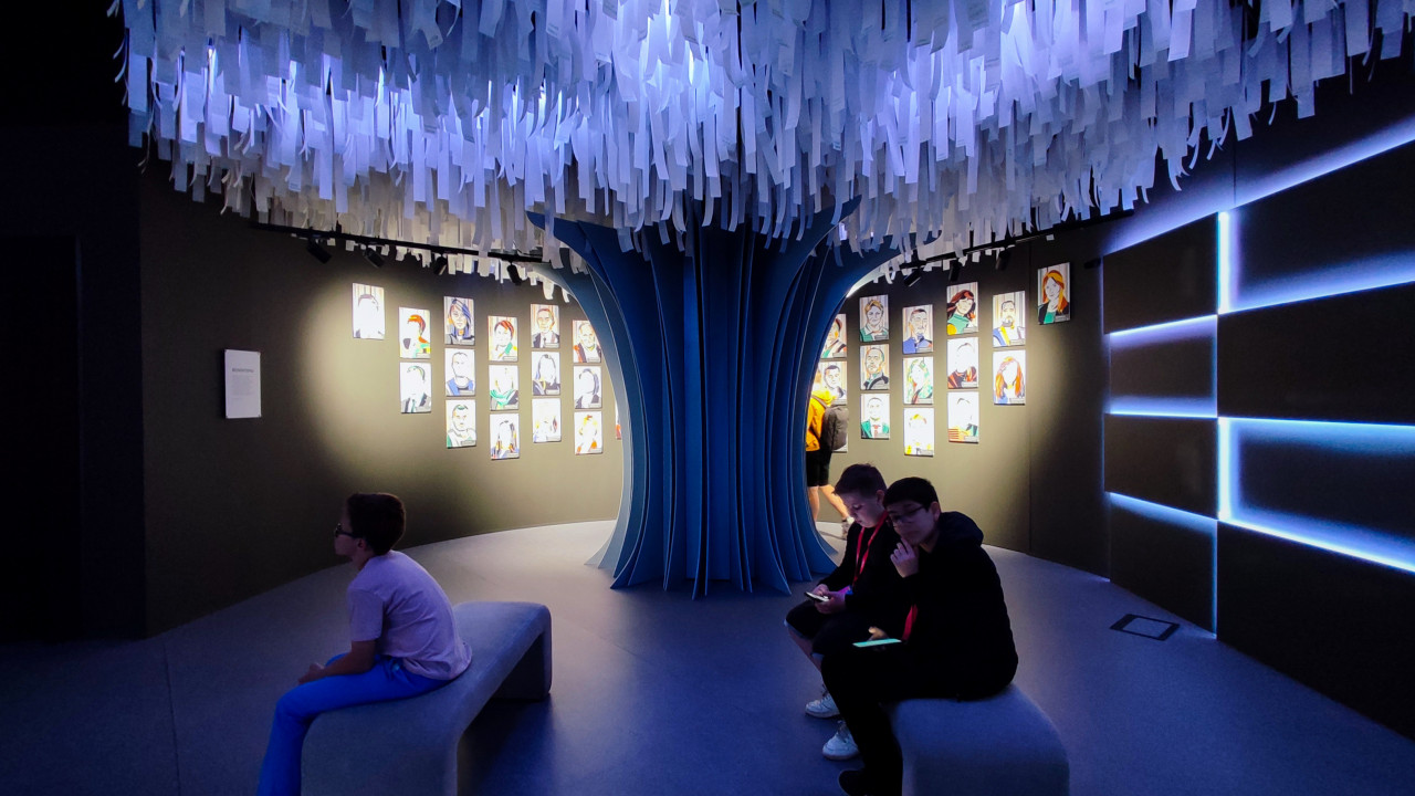 Фотография показывает интерьер одного из залов павильона «АТОМ» на ВДНХ, где расположена экологическая экспозиция с арт-объектом в виде дерева. Дерево украшено 2500 листочками из материала Drop Paper®, содержащими имена волонтёров, участвующих в проектах по сохранению земли и её ресурсов. Вдоль стен размещены портреты волонтёров, а в зале предусмотрены места для посетителей. Экспозиция была представлена в 2023 году в рамках выставки-форума «Россия» и ориентирована на общественное и экологическое просвещение.