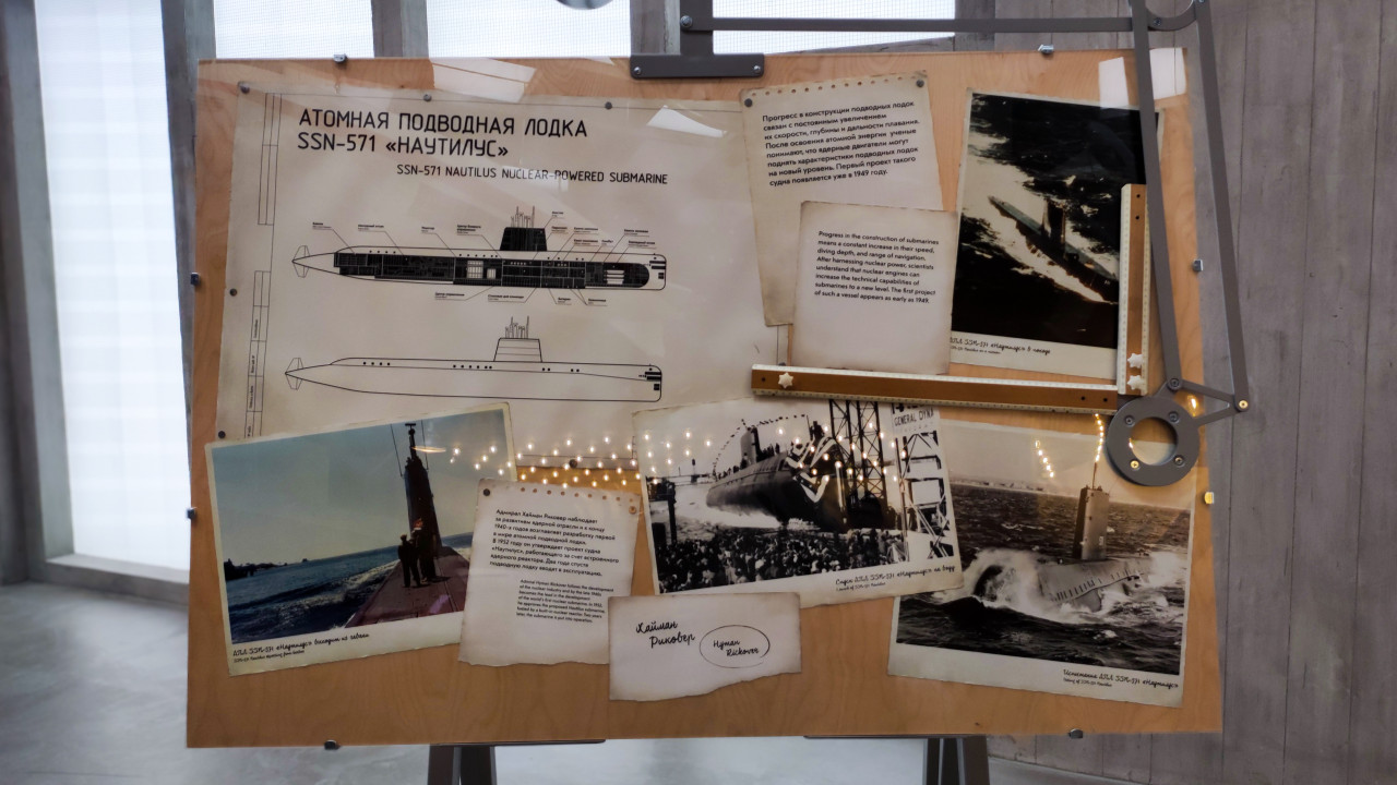Архивные материалы и чертежи атомной подводной лодки «Наутилус» на экспозиционном планшете
