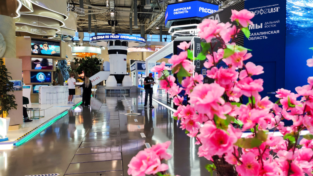 Фотография показывает центральный проход павильона №75 ВДНХ во время работы Международной выставки-форума «Россия». В кадре видны стенды регионов Дальнего Востока, включая Амурскую и Сахалинскую области, с крупными навигационными надписями и мультимедийными экранами. Пространство оборудовано выставочными конструкциями, интерактивными зонами и информационными стойками, по проходу перемещаются посетители. Снимок иллюстрирует масштаб экспозиции, организацию выставочного зала и формат представления регионов страны на федеральном мероприятии.