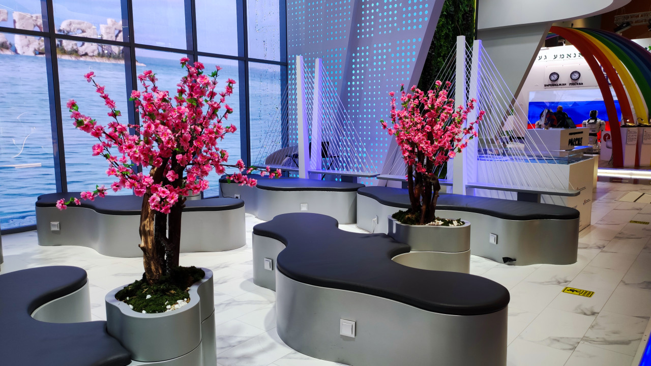 Снимок выполнен в павильоне №75 ВДНХ и отражает часть региональной экспозиции выставки-форума «Россия». В центре композиции расположена зона отдыха с волнообразными сиденьями и декоративными деревьями, рядом установлен макет вантового моста как символ транспортной инфраструктуры региона. На заднем плане видны интерактивные панели и элементы других стендов. Экспозиция предназначена для наглядного представления инфраструктурных и пространственных особенностей субъектов Российской Федерации и используется в образовательных и презентационных целях.