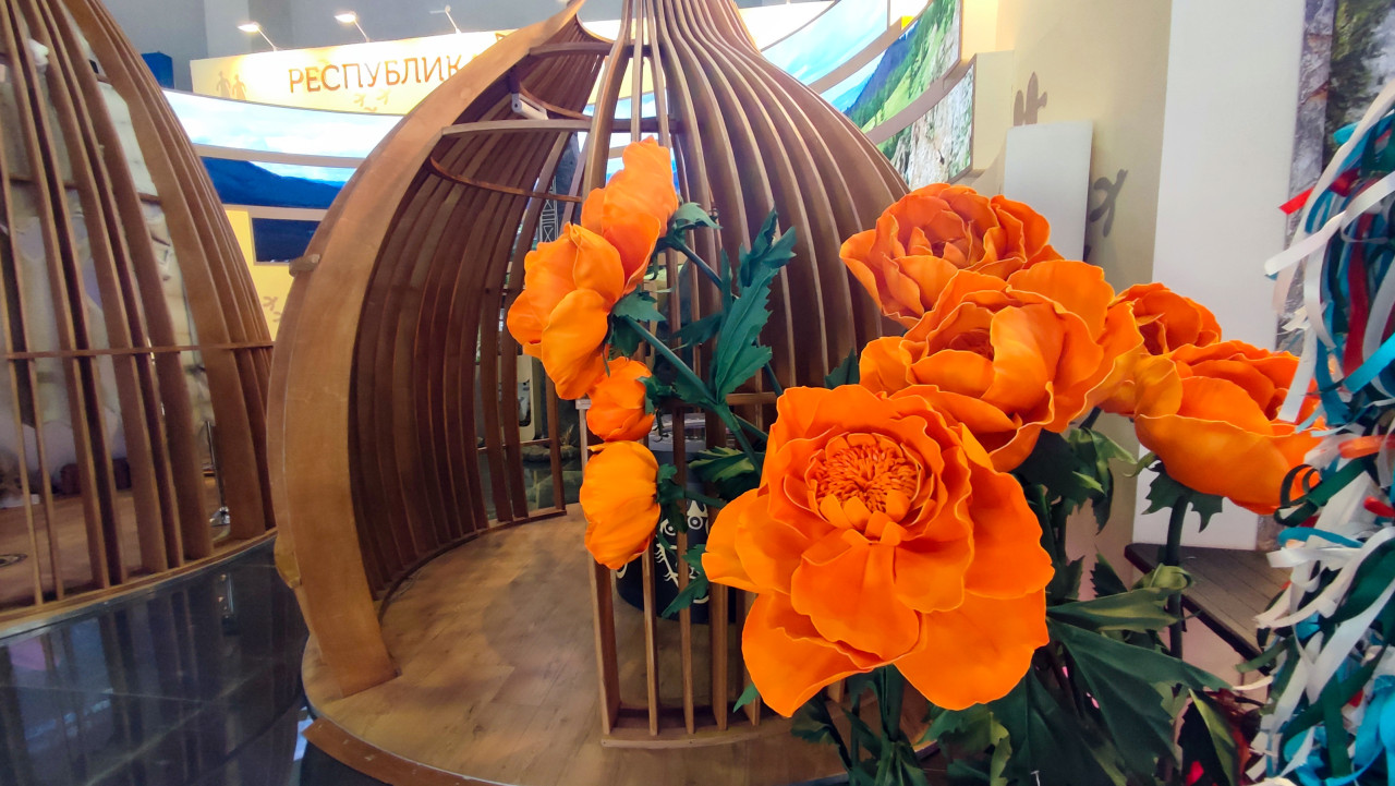 На фото представлена часть региональной экспозиции в павильоне №75 ВДНХ с декоративной деревянной конструкцией и крупными искусственными цветами оранжевого цвета. Элемент оформления относится к стенду одного из регионов Сибири и демонстрирует использование природных мотивов в выставочном дизайне Международной выставки-форума «Россия». Конструкция выполнена в форме каркаса традиционного жилища и дополнена флористическими объектами. Фотография подходит для иллюстраций, посвящённых выставочному дизайну, культурным традициям регионов и современным формам презентации народного наследия.