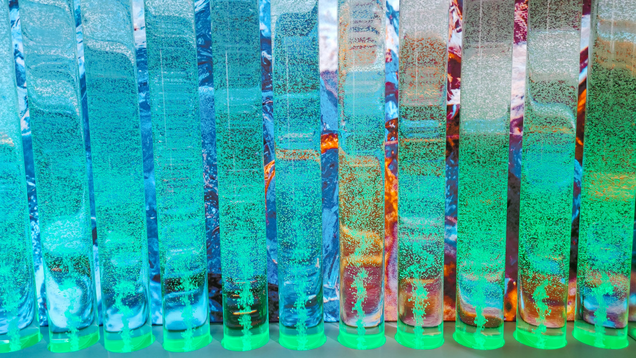 Фотография сделана в павильоне №75 ВДНХ и демонстрирует фрагмент интерактивной световой инсталляции, состоящей из вертикальных прозрачных колонн с подсветкой. Внутри элементов видны пузырьки и декоративные включения, создающие эффект движения и глубины. Инсталляция используется как визуальный и технологический элемент оформления регионального стенда в рамках выставки-форума «Россия». Объект подчёркивает современный характер экспозиции и может применяться для иллюстраций о выставочном дизайне, мультимедийных решениях и интерактивных форматах.