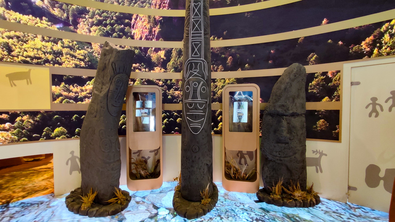 Каменные изваяния и интерактивные экраны экспозиции Хакасии