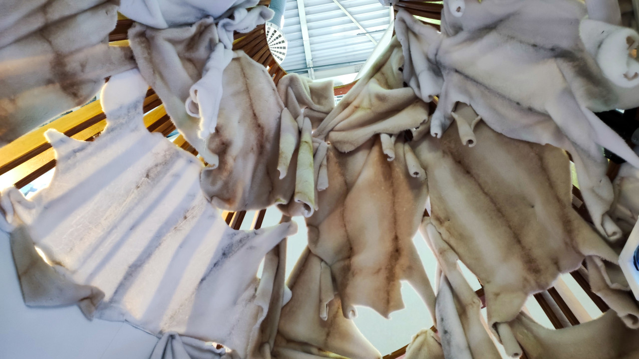 На фотографии запечатлён вид снизу на потолочное оформление этнографической инсталляции в павильоне №75 ВДНХ, созданной для Международной выставки-форума «Россия». В кадре видны подвешенные текстильные элементы, формирующие замкнутое пространство внутри стенда и отсылающие к традиционным формам жилища и быта сибирских народов. Экспозиция была представлена в зале B и сочетала предметный декор с архитектурными решениями. Снимок может использоваться для иллюстраций о выставочной архитектуре, этнографии и дизайне пространств.
