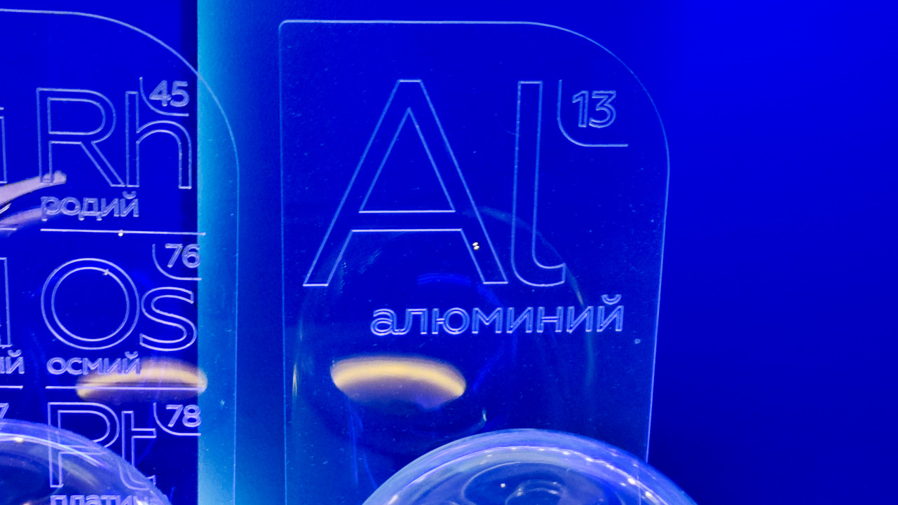 На изображении запечатлён фрагмент экспозиции Красноярского края с графической панелью, посвящённой алюминию. В кадре видны обозначение химического элемента Al и стеклянные колпаки с подсвеченными экспонатами. Экспозиция входила в состав стенда региона на выставке «Россия» в павильоне №75 ВДНХ и рассказывала о значении алюминиевой промышленности для экономики Красноярского края. Фотография может использоваться в материалах о промышленности, ресурсах Сибири, металлургии и выставочных проектах.