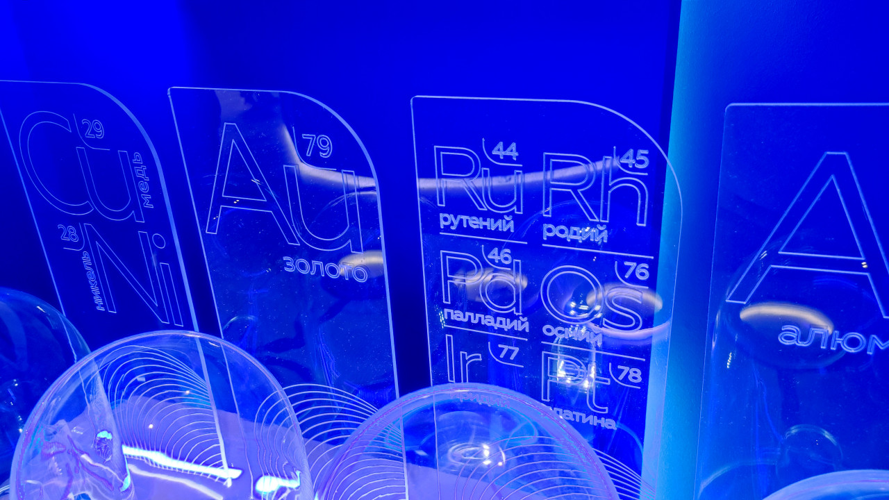На фотографии запечатлён фрагмент интерактивного экспоната «Металлы Сибири», представленного на стенде Красноярского края на выставке «Россия» в павильоне №75 ВДНХ. В кадре видны прозрачные защитные колпаки с подсветкой, графические панели с обозначениями химических элементов и стилизованная подача информации о минеральных ресурсах региона. Экспозиция была посвящена добыче и переработке металлов в Красноярском крае и являлась частью комплексного рассказа о промышленном потенциале территории. Фотография подходит для использования в материалах о природных ресурсах, промышленности, экономике регионов и выставочных проектах.
