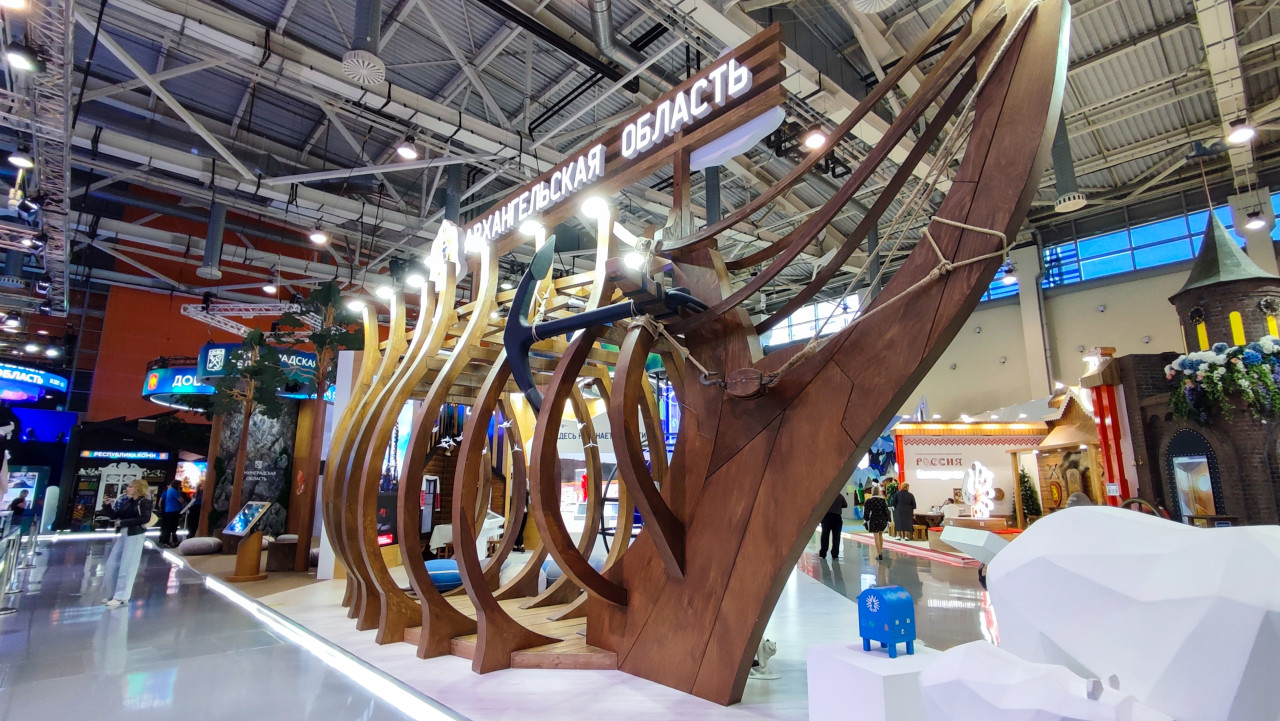 На фотографии запечатлена масштабная деревянная инсталляция, напоминающая каркас судна, размещённая на стенде Архангельской области в павильоне №75 выставки-форума «Россия» на ВДНХ. В конструкции использованы изогнутые деревянные элементы, канаты и якорь, отсылающие к истории судостроения и морского освоения Севера. Экспозиция является частью регионального стенда и демонстрирует культурные и исторические особенности области. Фото подходит для публикаций о региональной идентичности, выставочном дизайне и историческом наследии.