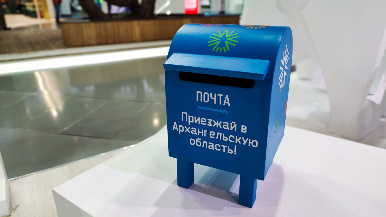 На фотографии представлен почтовый ящик синего цвета как часть интерактивной экспозиции Архангельской области в павильоне №75 Международной выставки-форума «Россия» на ВДНХ. В кадре акцент сделан на форму объекта, декоративную графику и надпись, приглашающую посетителей познакомиться с регионом. Экспонат используется для создания ассоциаций с коммуникациями и путешествиями. Фото подходит для иллюстраций о выставочных форматах, туристическом маркетинге и дизайне экспозиций.
