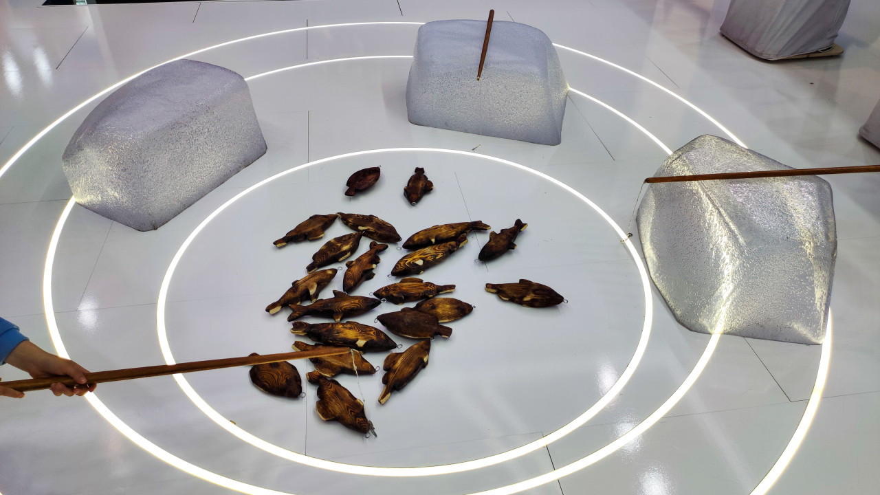 Фотография демонстрирует интерактивную инсталляцию в павильоне №75 выставки-форума «Россия» на ВДНХ, выполненную в виде круга с подсветкой на полу и размещёнными внутри деревянными фигурками рыб. По краям композиции расположены декоративные элементы, напоминающие льдины, а участники взаимодействуют с объектом при помощи деревянных палочек. Экспозиция связана с темой традиционного промысла и природных ресурсов региона. Снимок подходит для материалов об интерактивных зонах, народных промыслах и выставочных форматах.