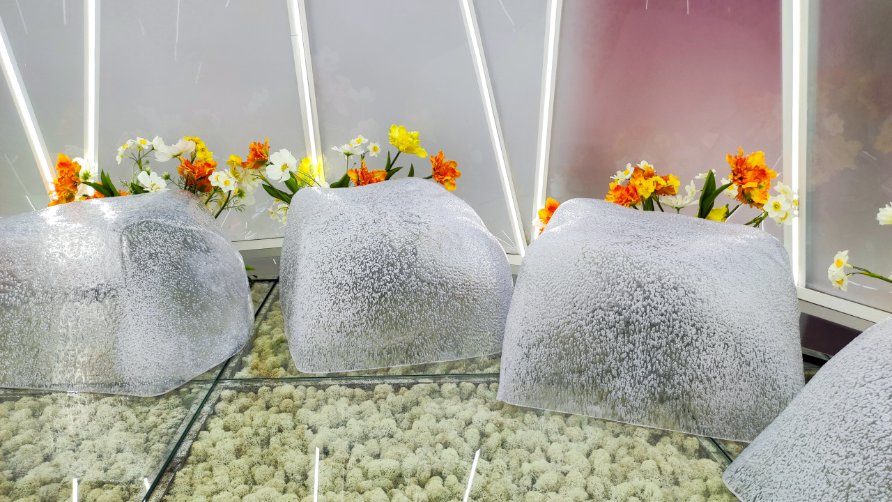 На фотографии представлена композиция из нескольких декоративных элементов в форме льдин, установленных на стеклянной поверхности и дополненных цветочными растениями. Экспозиция размещена в павильоне №75 Международной выставки-форума «Россия» на ВДНХ в Москве и является частью регионального стенда. Использование света, стекла и флористики подчёркивает природные и климатические особенности региона. Снимок подходит для публикаций о выставочных экспозициях, экологическом дизайне и художественном оформлении общественных пространств.